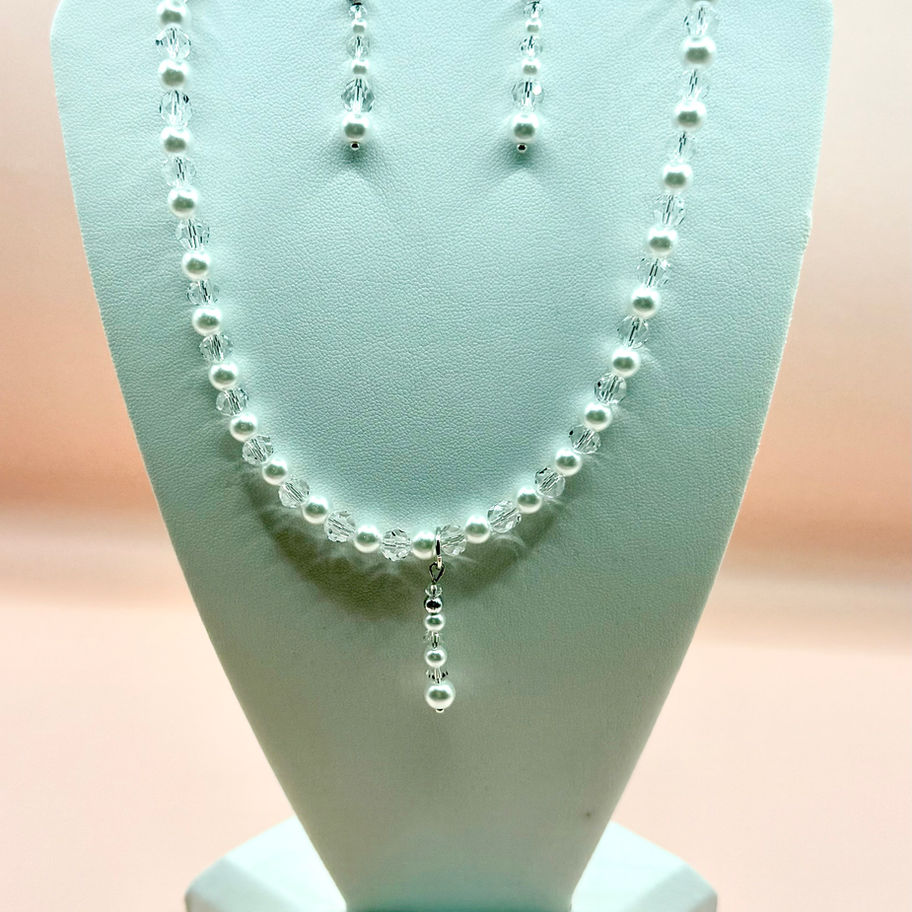 Elevate your bridal look with our exquisite Wedding Necklace and Earring Set featuring pearls and crystal beads. Crafted with precision and elegance, this stunning set promises to add a touch of timeless beauty to your special day. As part of Barbara's commitment to offering unique style for you and your family, this set effortlessly combines classic and contemporary elements. Perfectly designed to complement any wedding gown, it ensures you shine with sophistication. Make your big day unforgettable with this luxurious accessory set. Size 18"